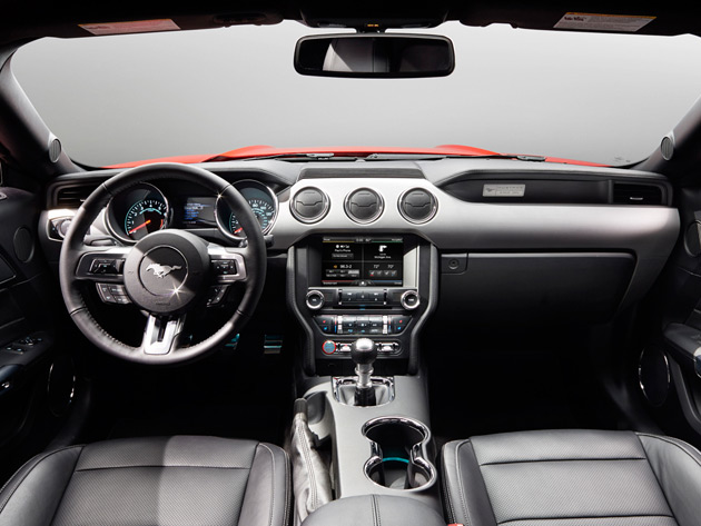 The interior of the vehicle gets a complete overhaul, boasting the highest degree of craftsmanship ever found in a Mustang. Large, clear instrumentation puts vehicle information right in front of the driver in the roomier cabin, while improved ergonomics and tactile switches and knobs provide better control. The added width and a new rear suspension contribute to improved shoulder and hip room for passengers, and a more usefully shaped trunk can accommodate two golf bags.