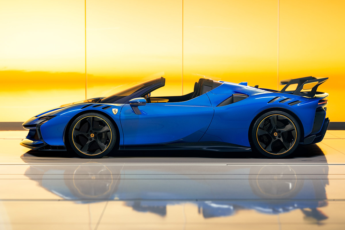 The car’s center of gravity thus appears to be lower too, particularly from the side. This is not just because of the roof, which has a wraparound windscreen that seamlessly melds with the side windows, but also because the flying buttresses are lower than on the SF90 XX Stradale. Although the rollbars protrude from the rest of the bodywork when the roof is lowered, the fact that they are carbon-fibre means they don’t sully the broad, squat look created by the flying buttresses. This in turn enhances the visual lowering of the car’s volume.