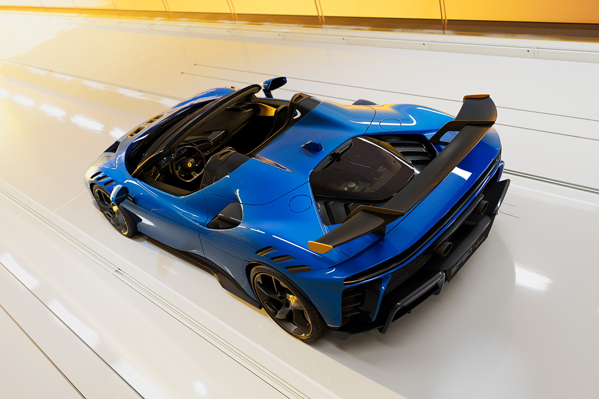 One of the layers is the fixed rear wing, a solution not seen on a street legal Ferrari since the 1995 F50. The second is the body-coloured profile that wraps around a light-bar, an element that is a complete departure from the twin-taillight concept of the SF90 Stradale. The third layer, already seen on the SF90, is the blown spoiler combined with an active aero concept known as a shut-off Gurney.