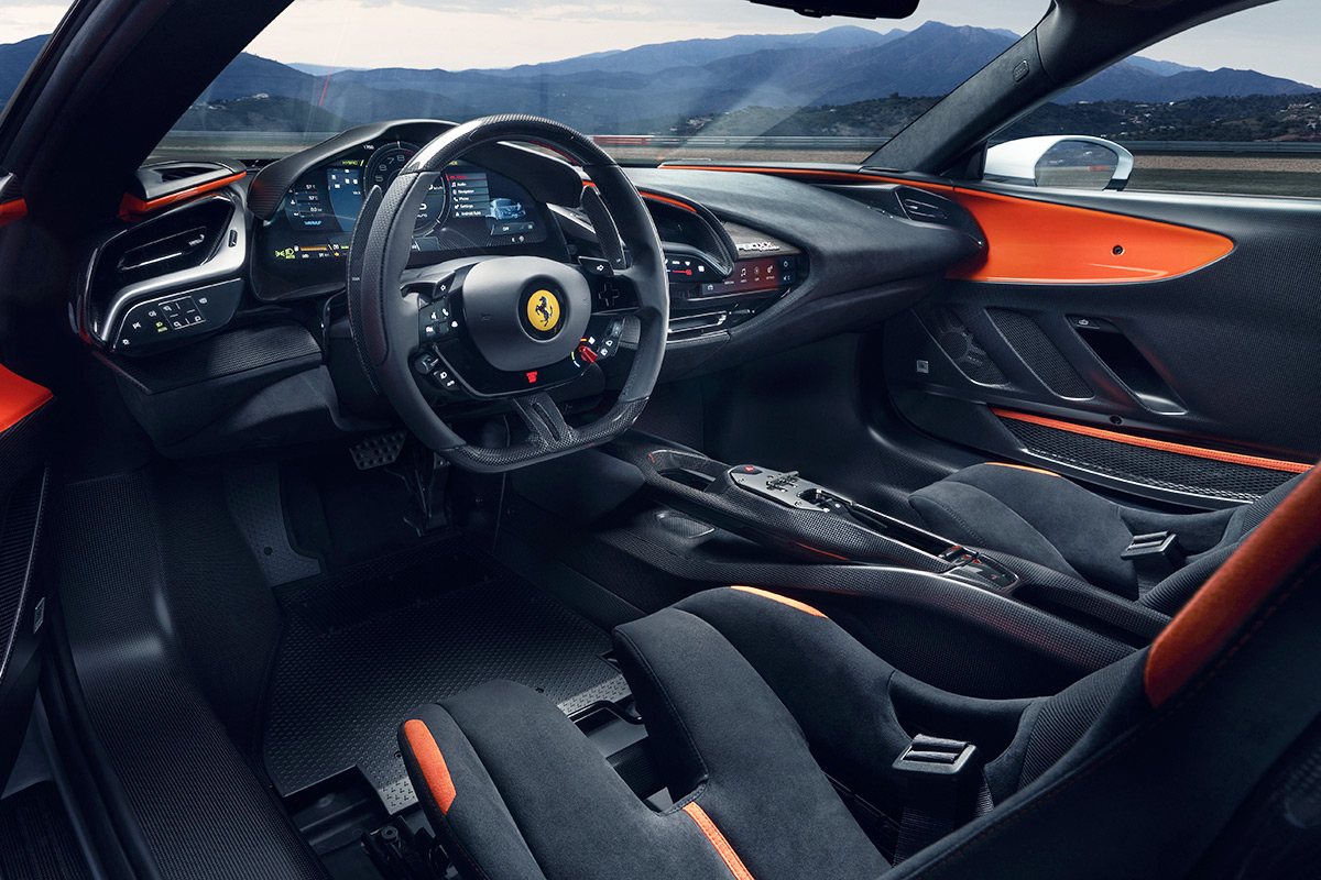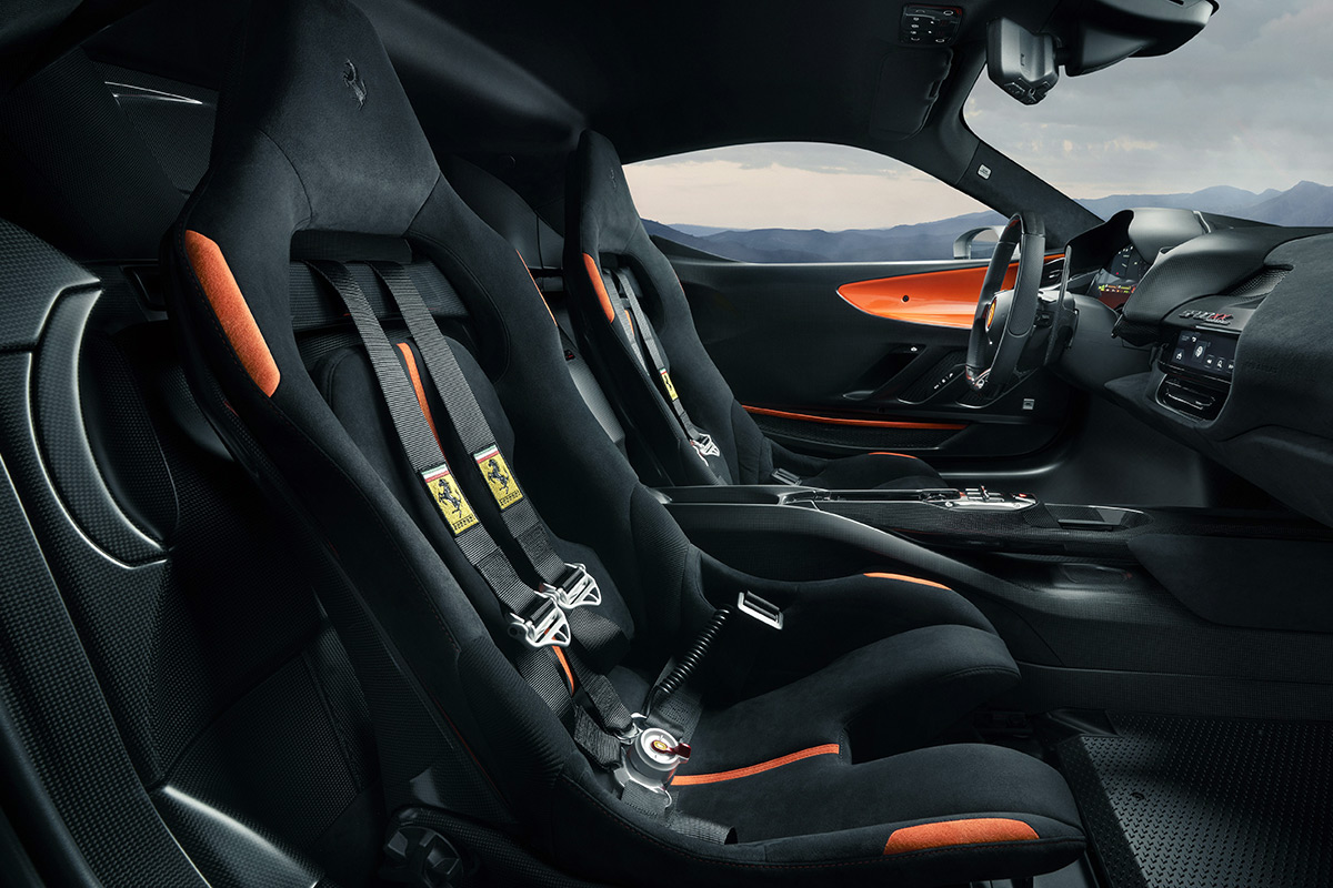A specific racing seat with a visible carbon-fiber tubular structure and cushion supports was designed for the car to enhance sporty driving pleasure without compromising on comfort. The backrest rake mechanism has been integrated into the seat using elastic trim materials which hide the separation between the backrest and seat squab. This means that the structure looks seamless at all times – just like a single-piece seat while also allowing the backrest to be adjusted. Together with the carbon-fiber structure, this feature saved 1.3 kg in weight compared to the SF90 Stradale’s single-piece seat.