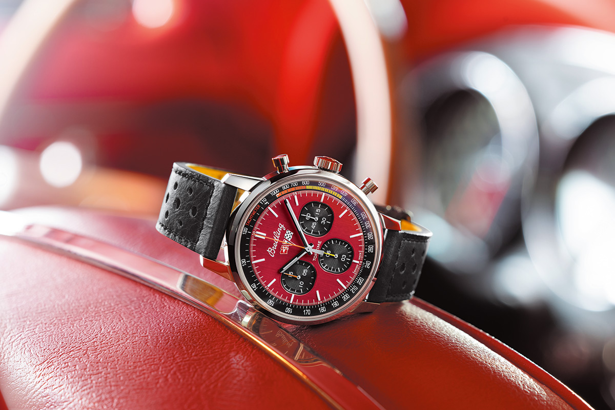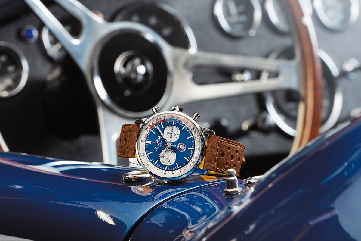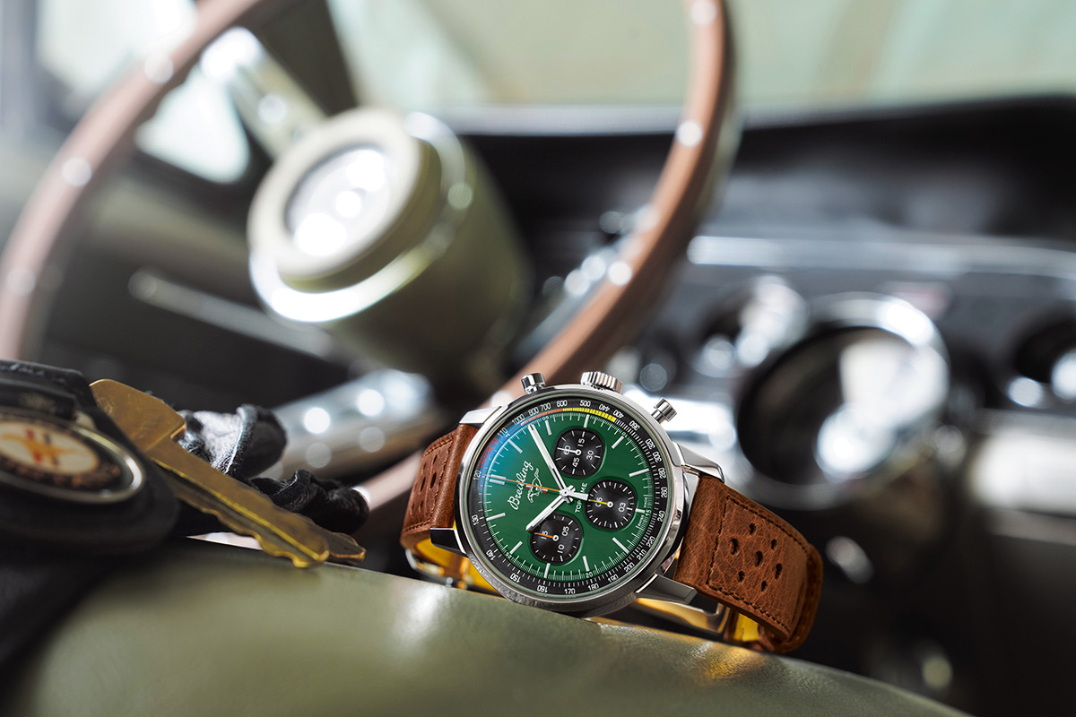 This unconventional trio of racing chronographs are inspired by the Chevrolet Corvette (red), the Ford Mustang (green) and the Shelby Cobra (blue), three icons of the American car culture. The timepieces themselves are a nod to the original 1960s Breitling Top Time models, which were designed for “young and active professionals”. Today’s modern-retro interpretations are perhaps even more youthful and free-spirited.