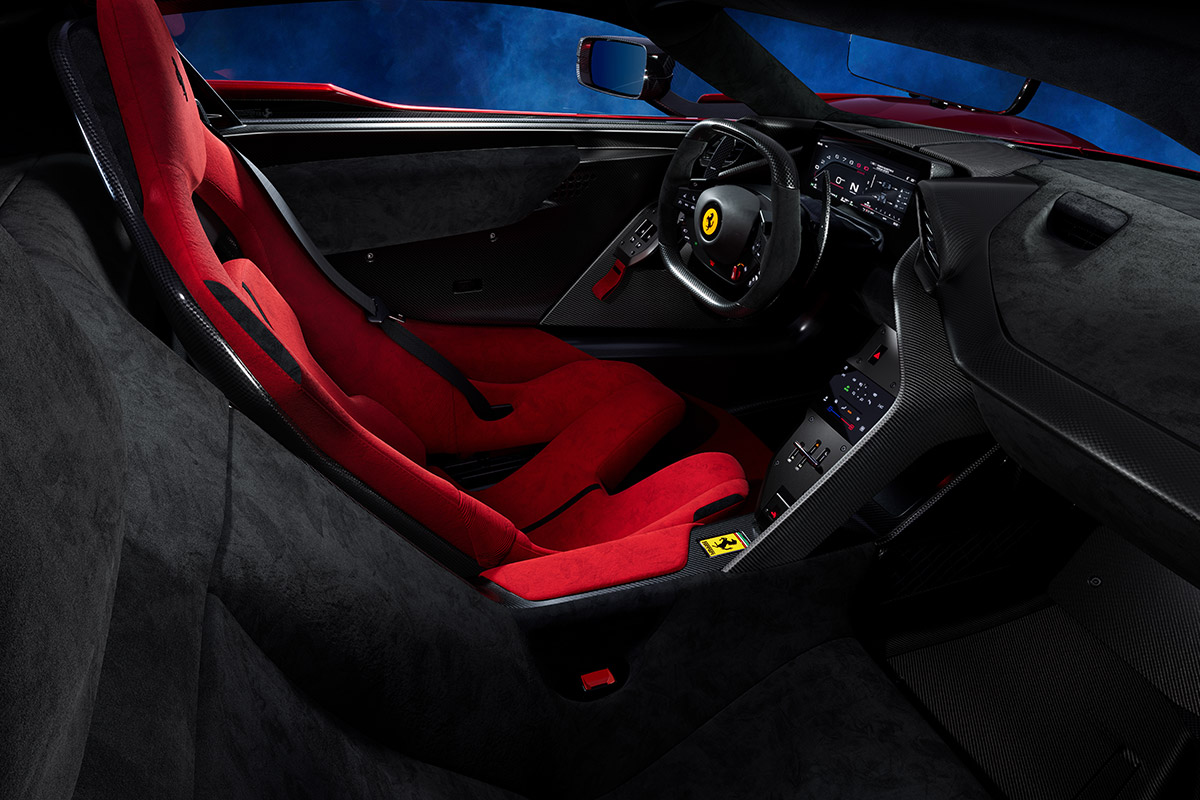 Here though the powertrain is further complemented by the introduction, for the first time ever on a Ferrari, of electric turbo technology (e-turbo), which, with an electric motor installed between the turbine and compressor of each turbo, allows for an extraordinary specific power output and instantaneous response from low down in the rev range.