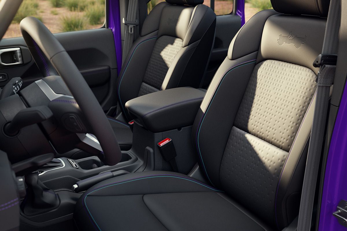 Step inside and the throwback continues. Jeep fitted the Rewind with bespoke Nappa leather seats embossed with patterns straight out of classic 8-bit arcade graphics, plus era-inspired accent stitching, color-matched painted interior details, and a unique dot-matrix shift knob cap. Wrangler buyers also get a swing-gate plaque and spare tire cover.