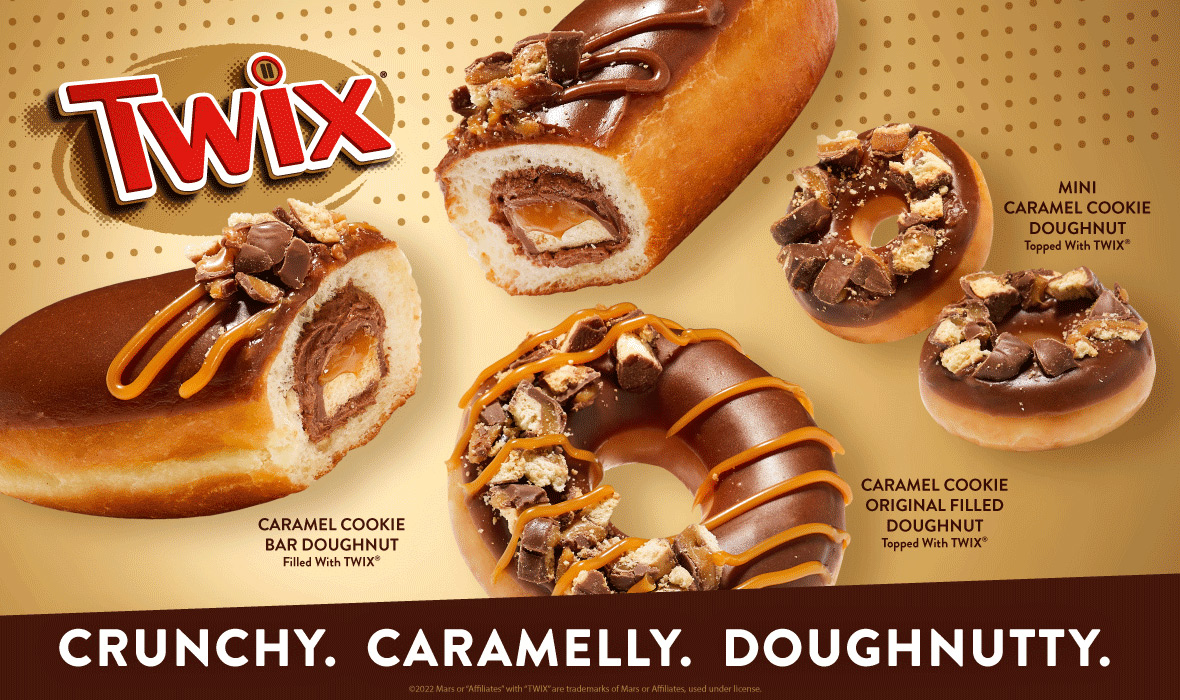 The regular sized doughnuts are available to purchase individually and as a specialty dozen to share containing four Caramel Cookie Crunch Bar Doughnuts filled with a TWIX Bar, four Caramel Cookie Crunch Original Filled Doughnuts topped with TWIX Bar pieces, and four Original Glazed Doughnuts.
