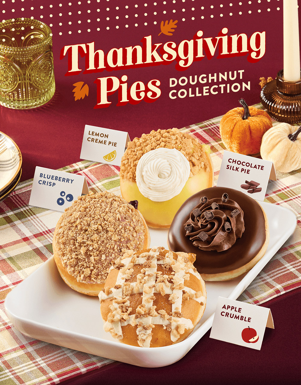 “There’s nothing more meaningful and traditional than spending time around the table with those we love this time of year. Our new Thanksgiving Pies Doughnut Collection was created with that in mind to help bring people together and sweeten the season of sharing joy and gratitude,” said Dave Skena, Global Chief Brand Officer for Krispy Kreme.