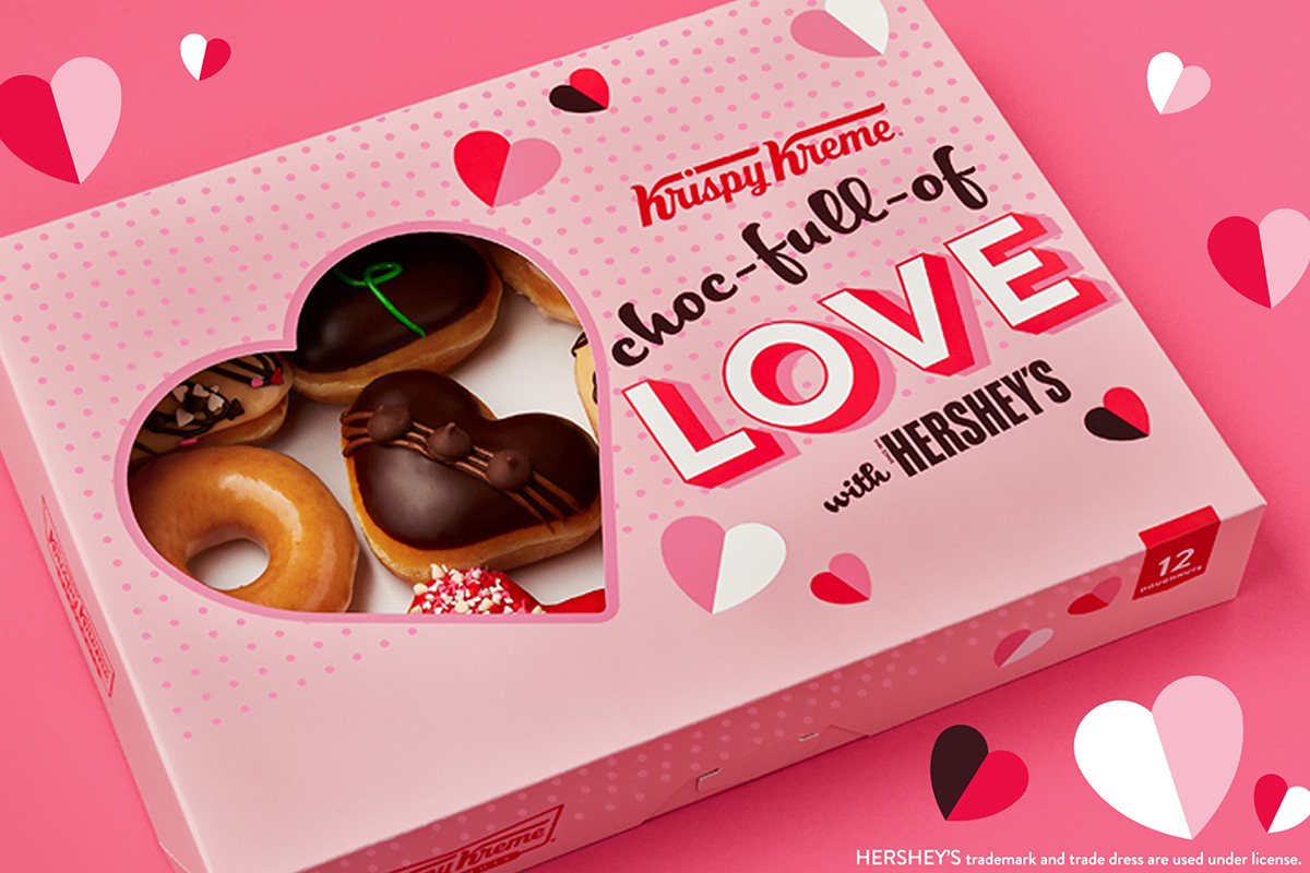 “This Valentine’s Day there’s no sweeter way to show you care than with a box of heart-shaped Krispy Kreme doughnuts made with real HERSHEY’s chocolate,” said Dave Skena, Global Chief Brand Officer for Krispy Kreme.