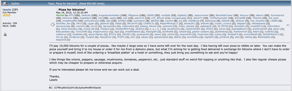 Hanyecz posted the following request on a Bitcoin forum: “I’ll pay 10,000 Bitcoins for a couple of pizzas. Like maybe 2 large ones so I have some left over for the next day. I like having left over pizza to nibble on later.”