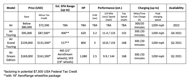 ($87,500 after USA federal tax credit)* - The fully equipped Air Grand Touring, available mid 2021, from $139,000