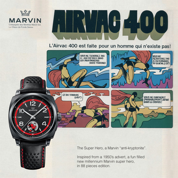 Drawing it’s inspiration from an advertisement from the 1950’s discovered in their archives, Marvin has created a superhero and showcases him in a fun-filled, exuberant fashion by launching an 88-piece limited edition watch.