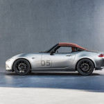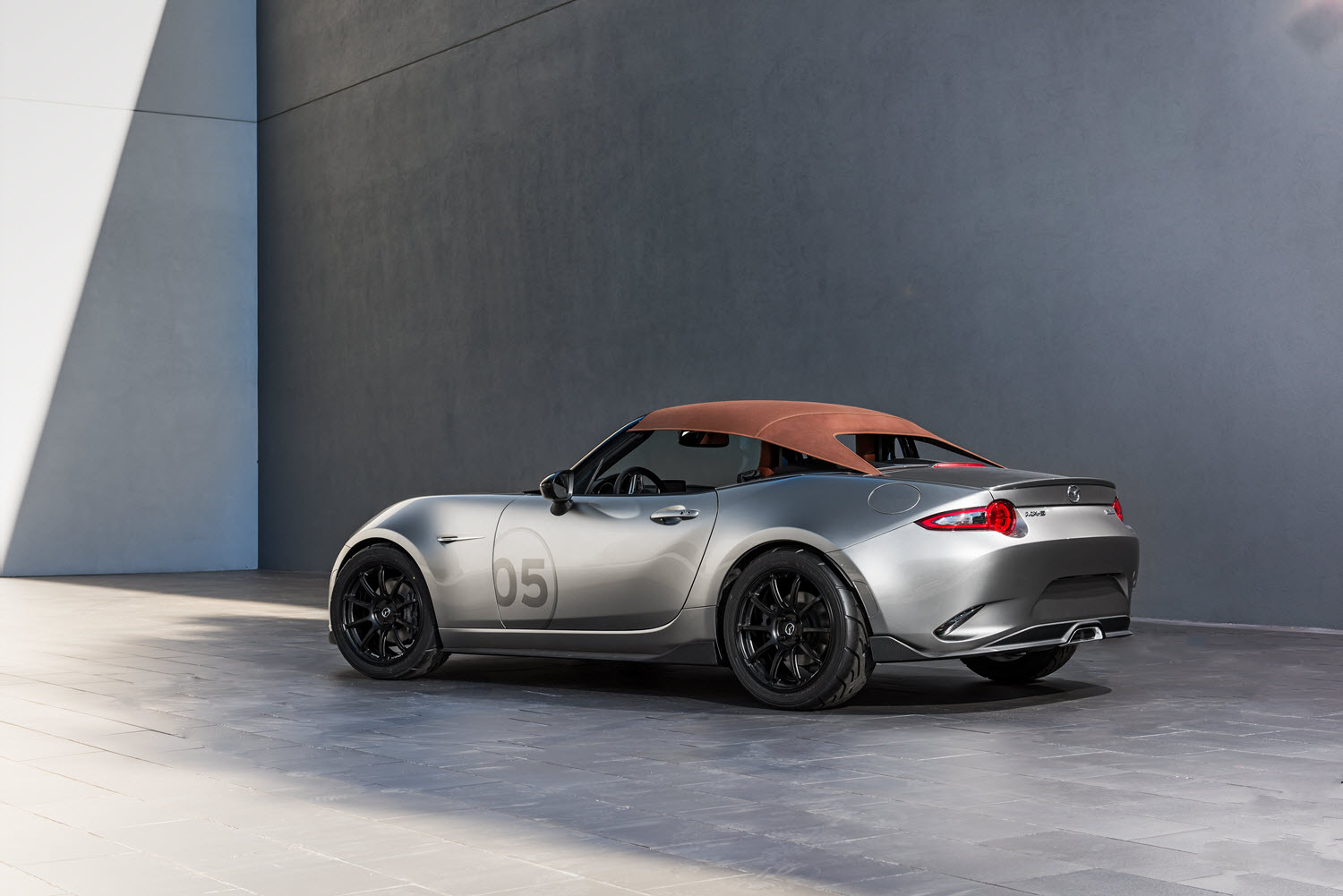 Other Speedster highlights include an adjustable coilover suspension, which lowers it by 30mm compared to the production-car, a Racing Beat center-mount exhaust, an interior retrimmed in Alcantara, carbon fiber Mu-Len Delta seats created exclusively for MX-5 and carbon fiber doors. In all, the lighter-weight materials have helped contribute to a weight loss of more than 250 lbs., with MX-5 Speedster weighing 2,080 lbs.