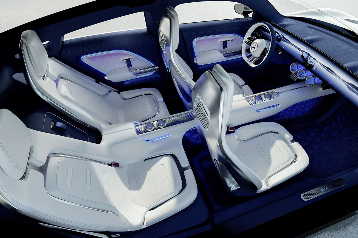 The interior of the Vision EQXX features a seamless display that spans 47.5 inches from one A-pillar to the other. With an 8K resolution, the thin, lightweight mini-LED display acts as a portal connecting the driver and occupants with the car and the world outside. A real-time 3D navigation system performs seamless zoom and scroll functions from satellite view down to a height of 33 feet in the 3D city representation. Executed on the one-piece display, it offers the user stunningly clear, accurate and intuitive route guidance.