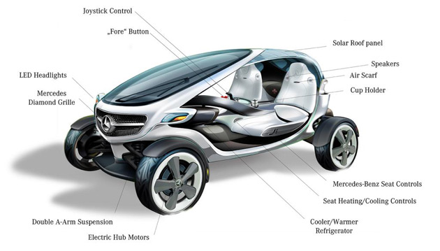 It has the latest in modern technology. Using touch screen monitors, virtually all aspects of the cart can be controlled without extra buttons. Simplicity is the key. Intuition and pure form can maybe best describe the cart“, says Margarete Wies, Head of the Mercedes-Benz Advanced Design Center in Carlsbad, California