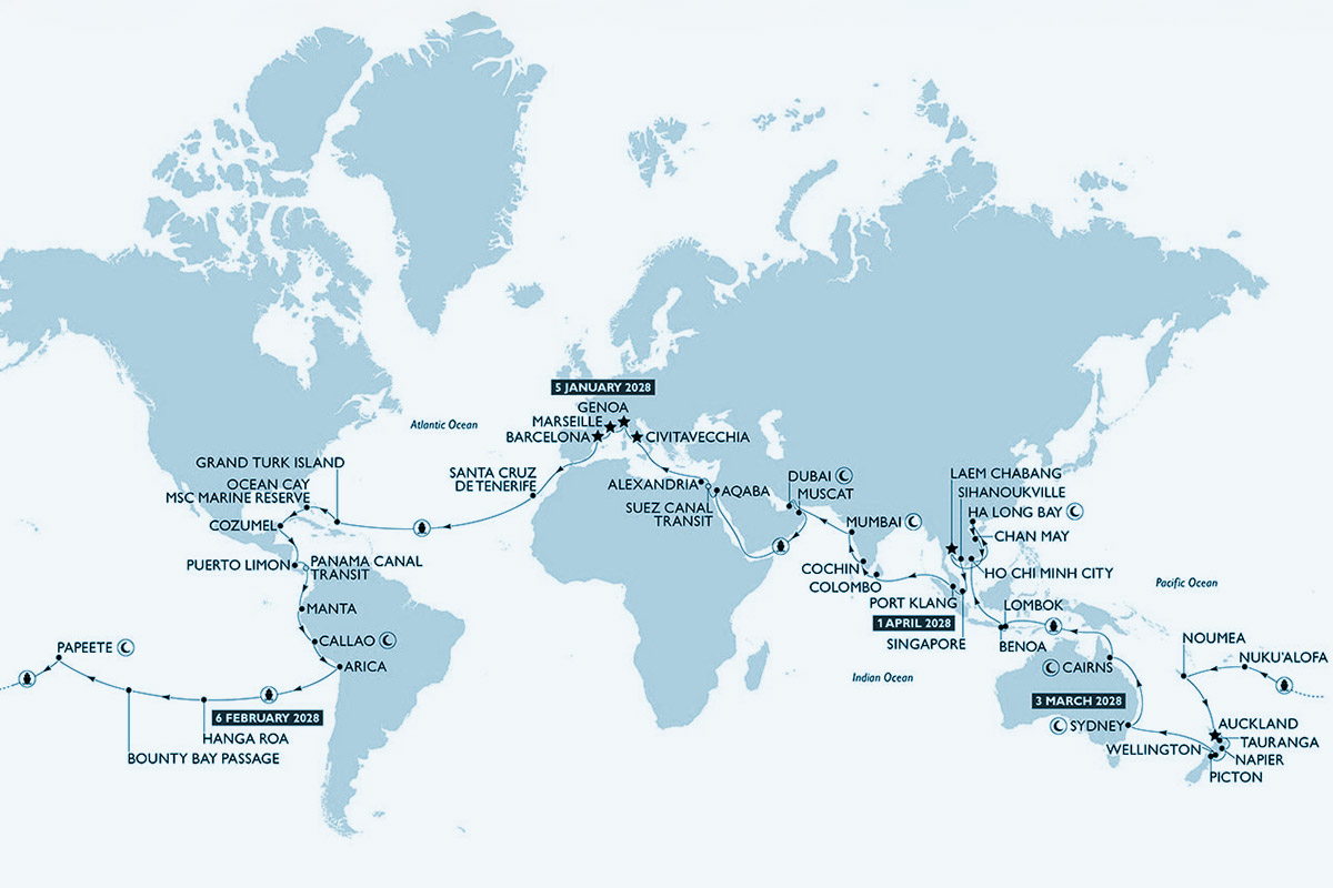 The journey kicks off from the Mediterranean in early January 2028, with embarkation options from Civitavecchia, Genoa, Marseille, and Barcelona between January 4-7. From there, the MSC Magnifica will head to the Caribbean, across the Pacific Ocean, into Australasia, up through Asia and the Arabian Peninsula, before returning into the heart of Europe.