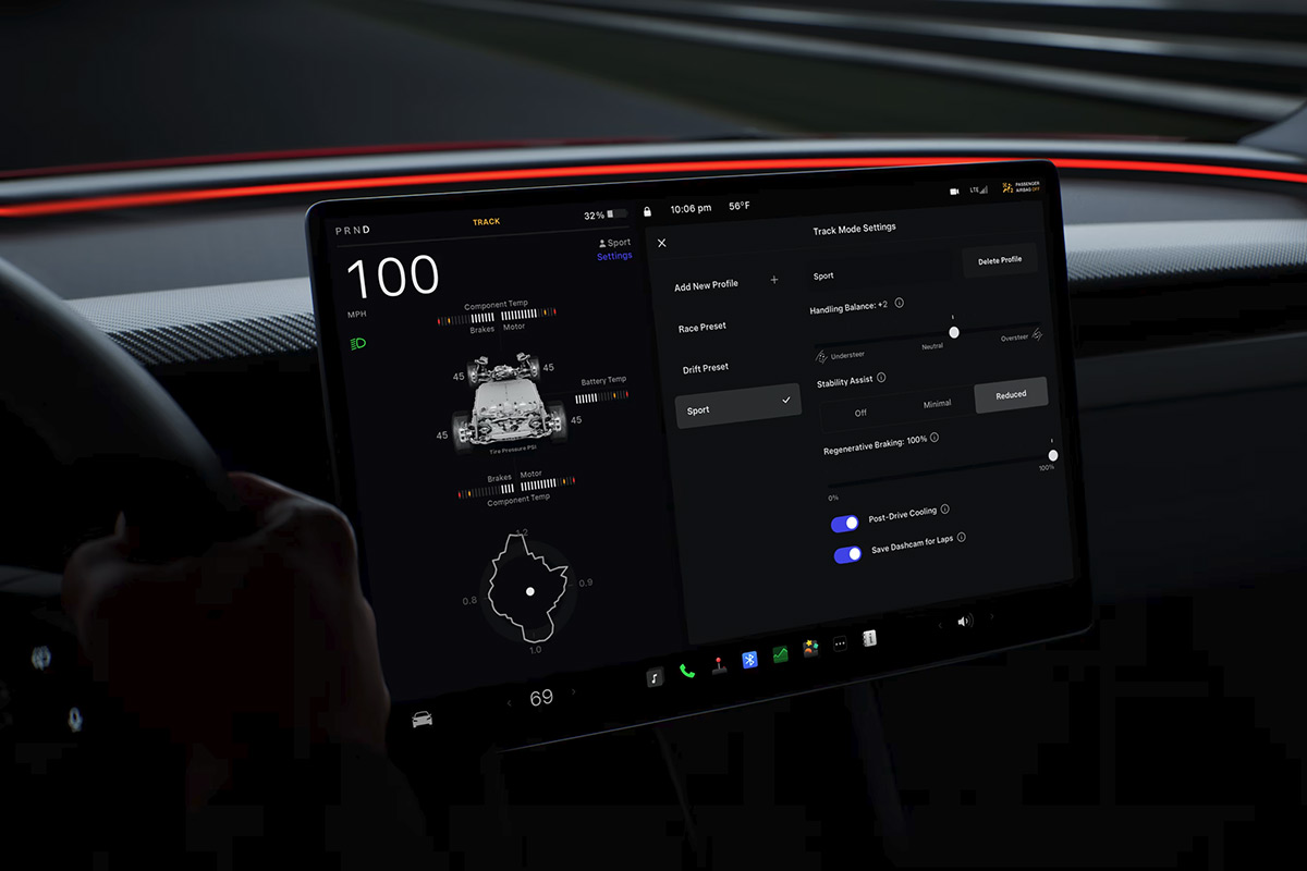 Track Mode V3 now integrates motor controls, suspension controls, powertrain cooling, and Tesla’s Vehicle Dynamics Controller (VDC) under a single, unified system. All-new controls and calibration within the powertrain and adaptive damping results in a more predictable experience that more accurately honors driver requests, and stability controls have been revised to allow drivers to explore the performance envelope in various track environments.
