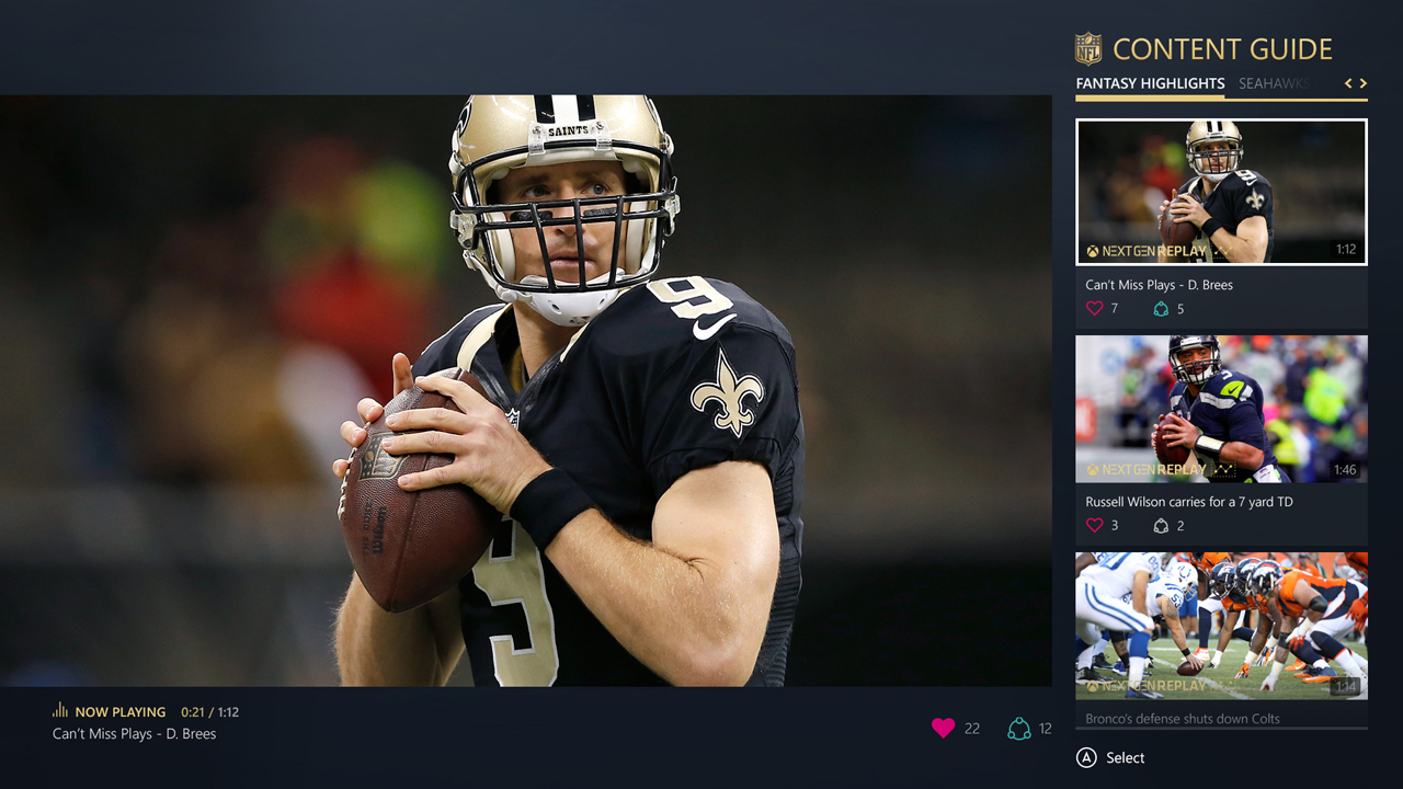 - New Replay Function: There’s a new replay function that will allow fans to watch replays from multiple angles and share to their Xbox Live contacts. When you snap the NFL App while watching live NFL games, there’s a new highlight reel section, where you can “like” big plays and keep track of the most popular highlights for the day.