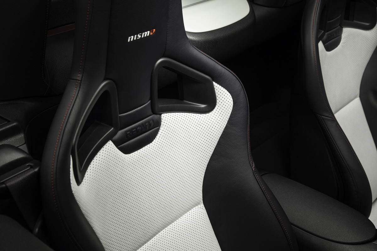 The Nissan 370Z NISMO Roadster Concept’s striking visual presence starts with the addition of GT-R-inspired functional and fully integrated aerodynamic body pieces, including a custom carbon-fiber rear spoiler created exclusively for use on the 370Z NISMO Roadster Concept. Inside, the NISMO-styled interior is just as stunning, anchored by black Recaro seats with custom off-white Ultrasuede inserts.”