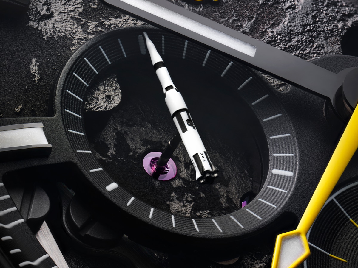 Another new touch is the patent pending small-seconds hand at 9 o’clock, which is engineered from Grade 5 Titanium and shaped like NASA’s iconic Saturn V rocket. The powerful 3D structure has been obtained by laser turning, while the colors are achieved with white varnish, ablation, and laser blackening. A small yet inspiring detail that celebrates the success of the Apollo program.