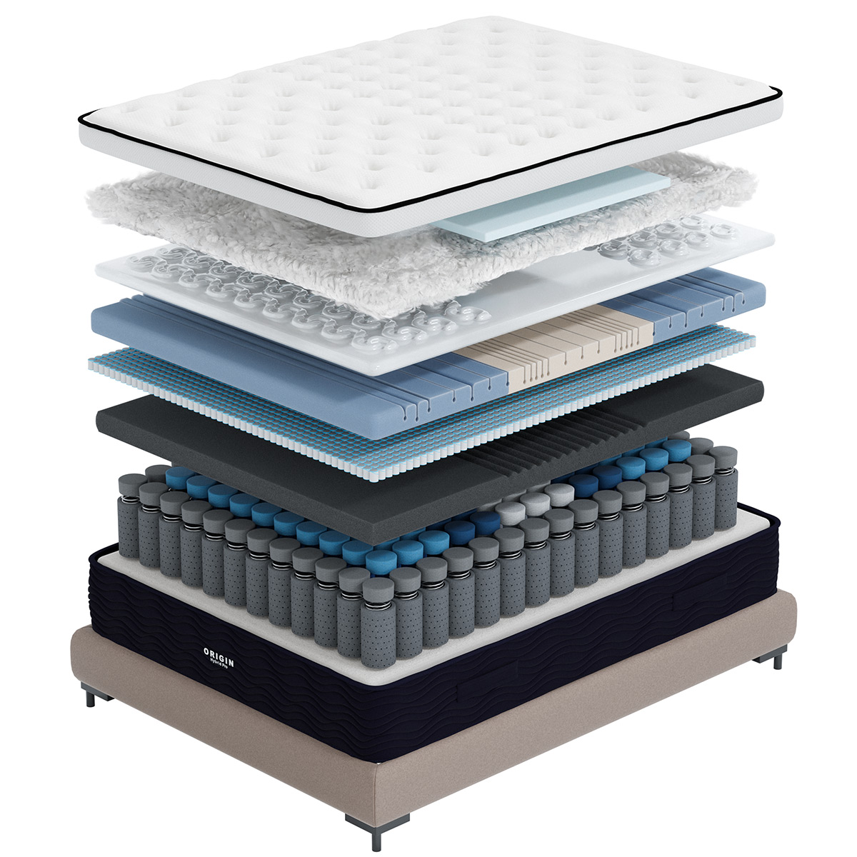 The topmost layer of the mattress is crafted from a super-plush Cashmere Tencel pillow top, providing a silky, cool-to-the-touch surface that enhances the overall sleep experience. The pillow top is stuffed with soft fluffy premium wool and suspended by the Origin Lift system. All work together to perfectly cradle your pressure points, offering a weightless, pressure-free sleep environment.