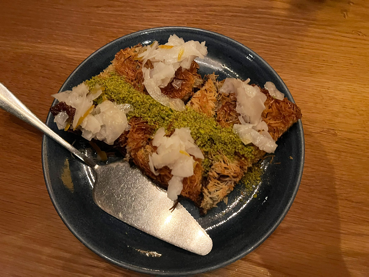 For dessert, we had the Chocolate Konafi, a sophisticated version of a popular Israeli dessert. This delectable buttery pastry is made with threads of semolina dough loaded with labneh, chocolate, and pistachio, topped with coconut jam. It’s sweet, crunchy, and oh so delicious. I went in for seconds with no shame, it was just that good. I had a long walk back to the PATCO station afterwards, so I’d just burn the extra calories that way. 🙂