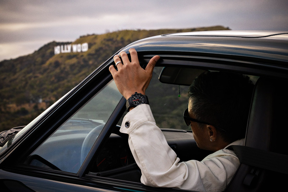 True to the original, the watch and bracelet are finished in a matte black, but with an upgraded Titanium-carbide coating. They’ve swapped the traditional tachymeter with a legacy-spec “1 Mile” rehaut for the US market and added a Japanese day wheel as an homage to their friends in Japan. To round it out, they made sure to include the old-school Porsche Design logo and font and threw in a small H at 6 o’clock in Porsche’s iconic red hue. This watch is everything they love about the original Chronograph 1 and then some.
