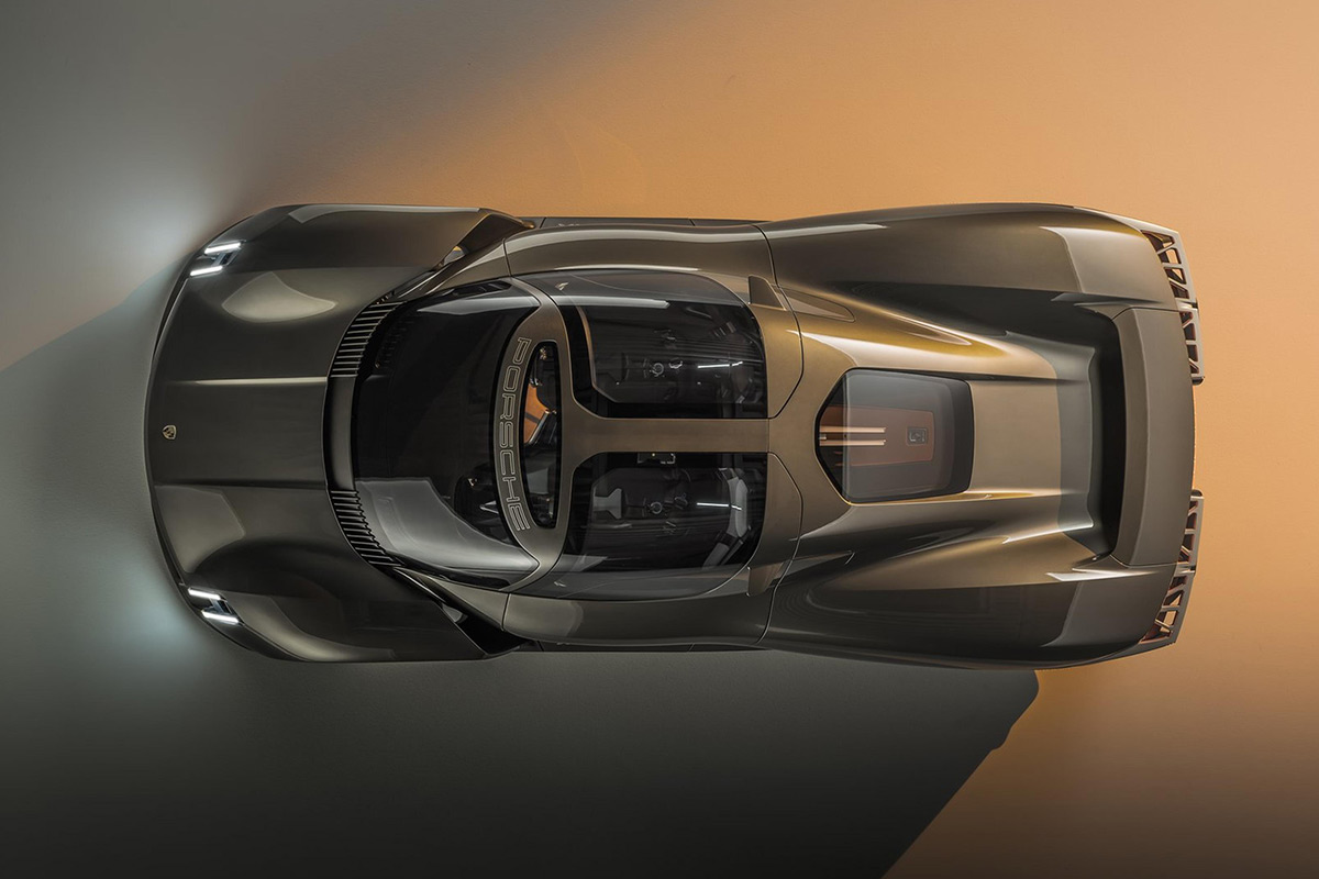 A lightweight glass dome with an exoskeleton made of carbon fiber reinforced plastic extends over both occupants. Le Mans-style doors are attached to the A-pillar and the roof; they open forwards and upwards. This type of door was previously used on the legendary Porsche 917 racing car. Another eye-catcher is the light signature: The designers have reinterpreted the Porsche four-point graphic. The vertical base form of the headlights was inspired by historic racing cars such as the Porsche 906 and 908 and drawn well down towards the road. A high-tech support structure frames the LED light modules and presents the exposed narrow elements of daytime running lights and indicators. When activated, the light opens up like an eye blinking open. Fully illuminated, the headlights make a confident statement.