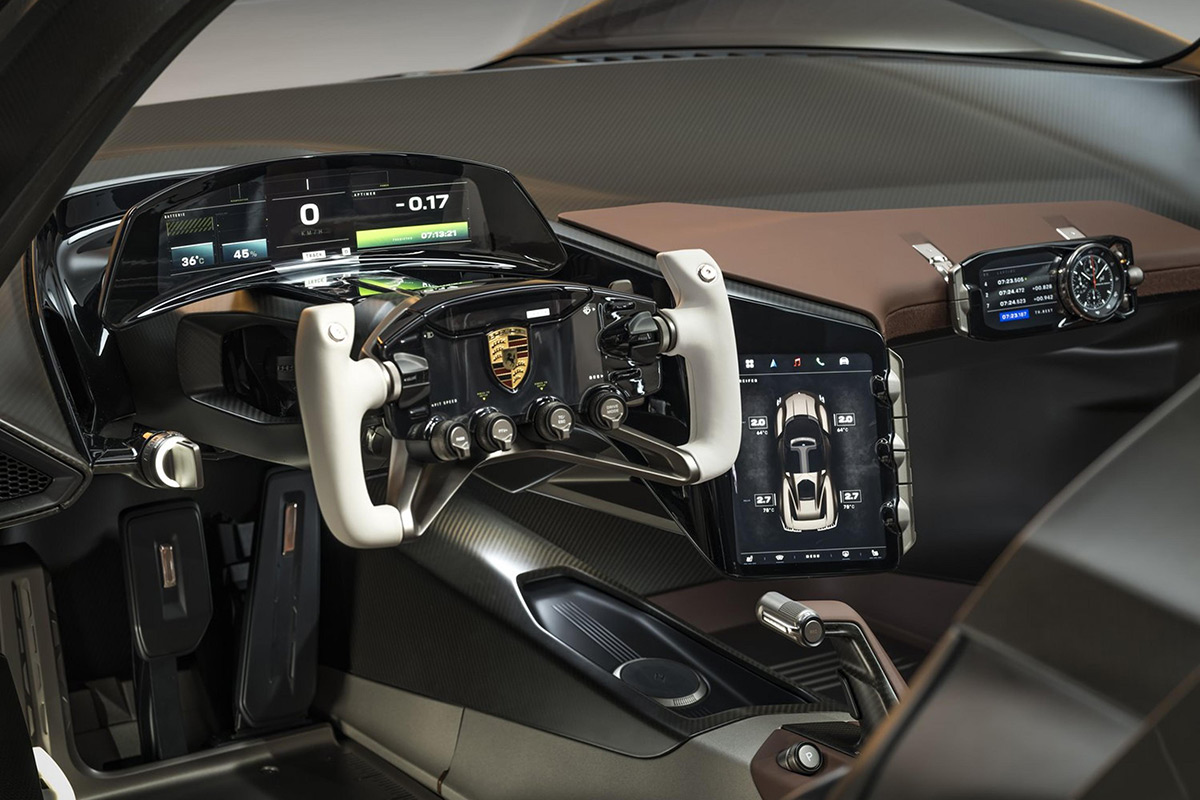 Another highlight is found on the passenger side, where there is a bayonet system embedded in the instrument panel to which a stopwatch module can be attached. For the Mission X, Porsche Design has created a special stopwatch module with an analogue and digital display. The clocks are designed for both racetrack and rally use and can display the lap times or vital data of the driver, among other information.