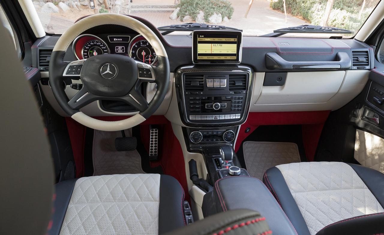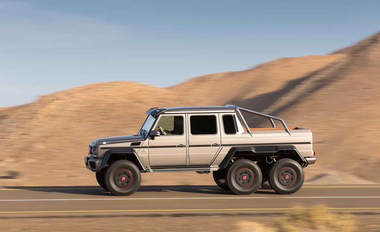 The G63 AMG 6×6 – A nearly 8-ft tall, 19-ft long, 9000-lb SUV. Six massive 37-inch tires. Twice the ground clearance of a G-Class and a fording depth of 39 inches. Three axles and five locking differentials. When its 536-hp biturbo V-8 rumbles to life, 560 lb-ft of torque will hurtle you to 60 mph in 7.8 seconds.