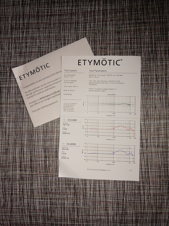 My complimentary review earphones arrived in a very “value added” black box that gave me the immediate feeling that here was something special. Justified. After spending about $350 for something you can hold in a closed fist, the packaging should impress, and the Etymotic folks don’t let us down. The first thing you’re going to find within all the neatly nested boxes is a “performance report.” This is no joke. Someone at the factory puts the earphones on a signal generator and several graphs are produced, verifying the frequency responses of your device. Nice.