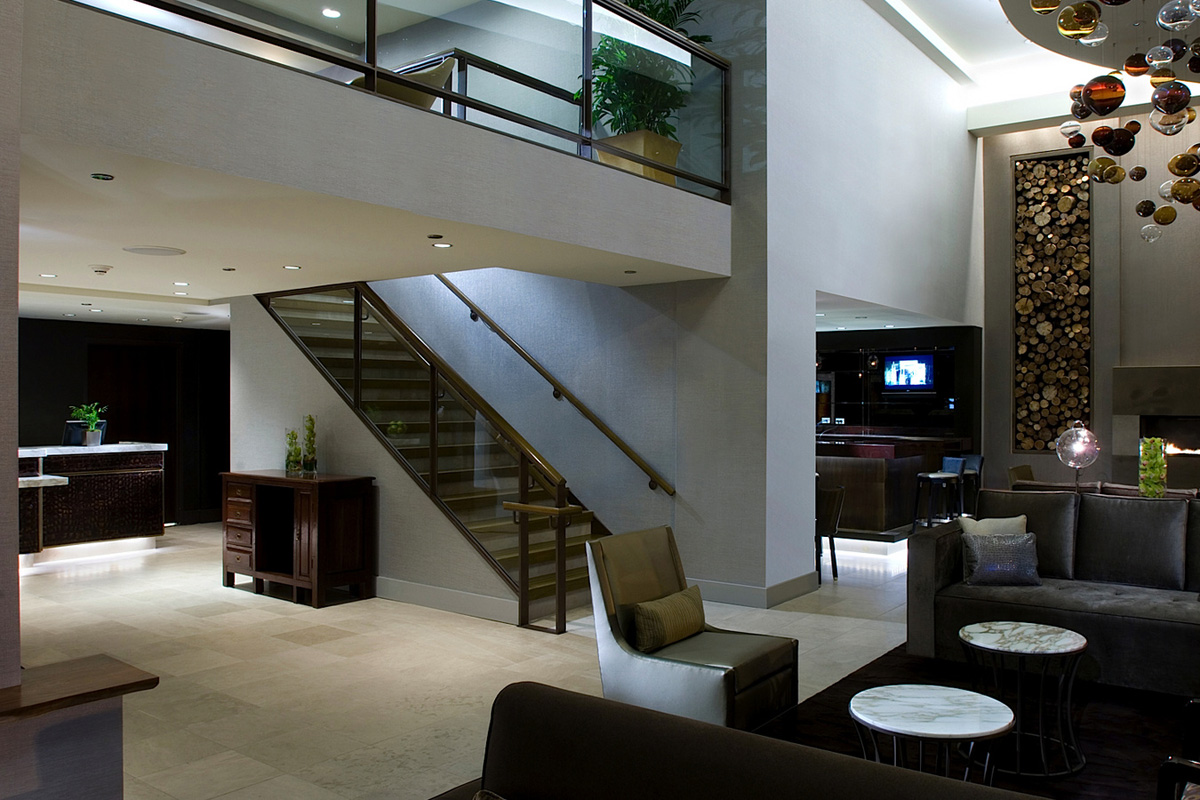 When entering the Hotel Felix lobby, you’re greeted by a ceiling-high mosaic of logs, water pond, and delicate orbs floating over a fireplace. These elements not only create a calming atmosphere throughout the hotel, but they also symbolize an “earth, wind, fire, and water” theme that embodies their commitment to being green. In fact, the Felix is the first hotel in downtown Chicago to receive a Silver LEED certification.