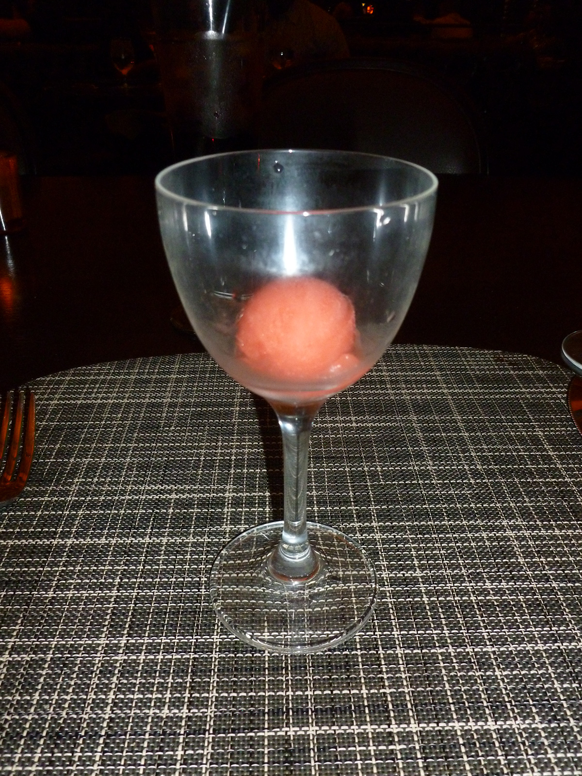 Next up was a refreshing blood orange sorbet, which acted as a quick palate cleanser. After that, the waiter brought out our main entrees. I decided to go with the Bone in New York Strip, which is dry aged in house for at least six weeks. My wife opted for the Seared Sea Scallops. And of course, we had to try the Everything French Fries that everyone talks about.