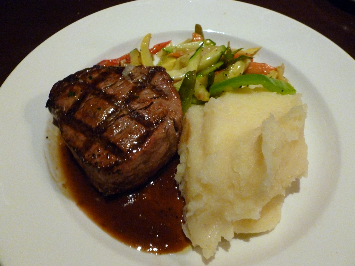 For my entrée, there were a number of tempting menu items to choose from. But since this is a steakhouse, I decided to order the filet mignon (medium), which comes with mashed potatoes and fresh veggies. The steak was cooked perfectly, and it was nice and juicy, with plenty of flavor to boot.