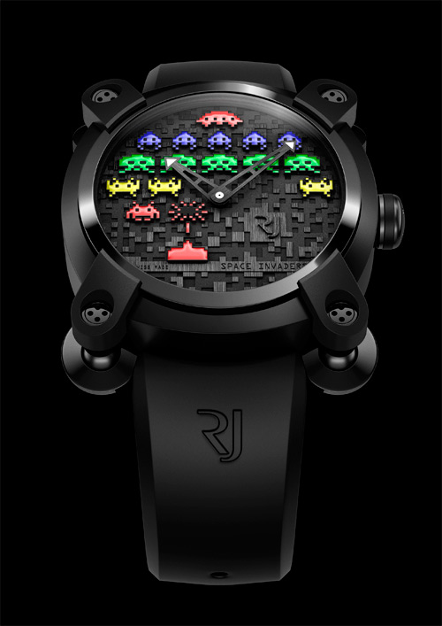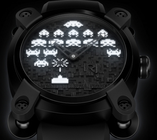 The Romain Jerome Space Invaders watch comes in both a “day version” (colorful version pictured above) and a “night version” (with glowing invaders, as you can see below).