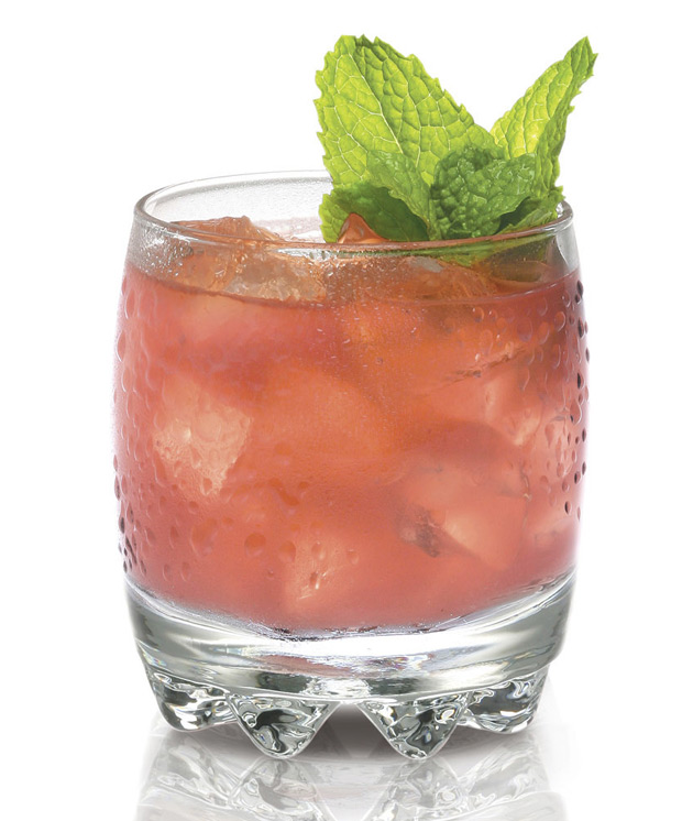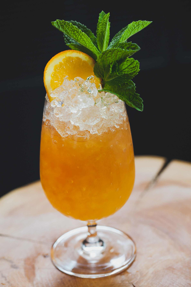 Combine all ingredients into a cocktail shaker with ice and shake vigorously. Strain contents into a rocks glass over crushed ice. Garnish with mint sprig and orange slice.