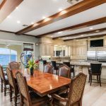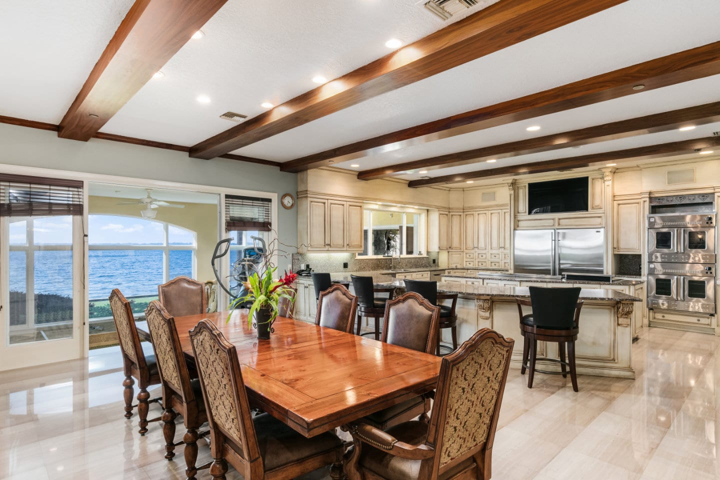 Well, there’s a two-story great room with a marble fireplace and floor-to-ceiling walls of glass overlooking the water. A huge chef’s kitchen, and a wood-paneled formal dining room that will hold up to 16 guests for a start. It also has 12 bedrooms and 15 baths (11 of which are full baths). This place could house an entire NBA team basically.