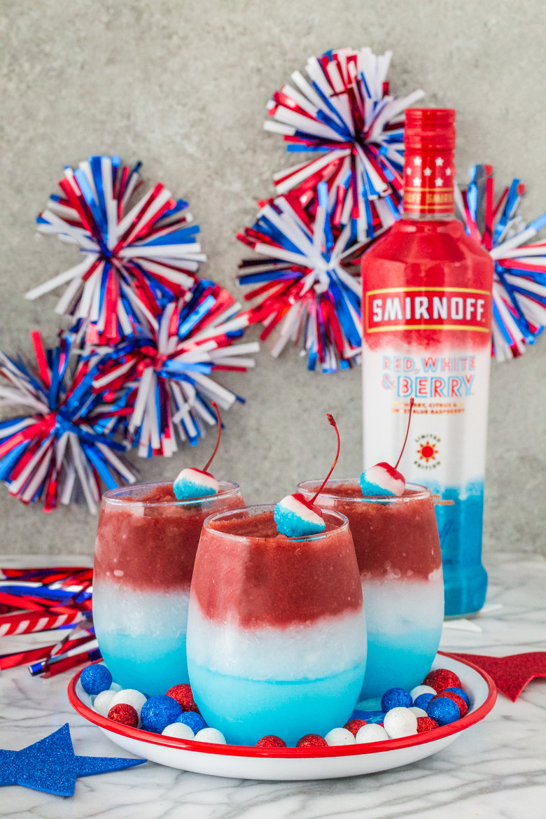 So what’s on the drink menu? A pair of patriotic red, white, and blue cocktails that feature Smirnoff Red, White and Berry, courtesy of Megan Marlowe from The Strawberry Blondie Kitchen. They’re amazing, with versatile flavors like cherry, blue raspberry and citrus, and I know that they’re going to be a huge hit with our guests.