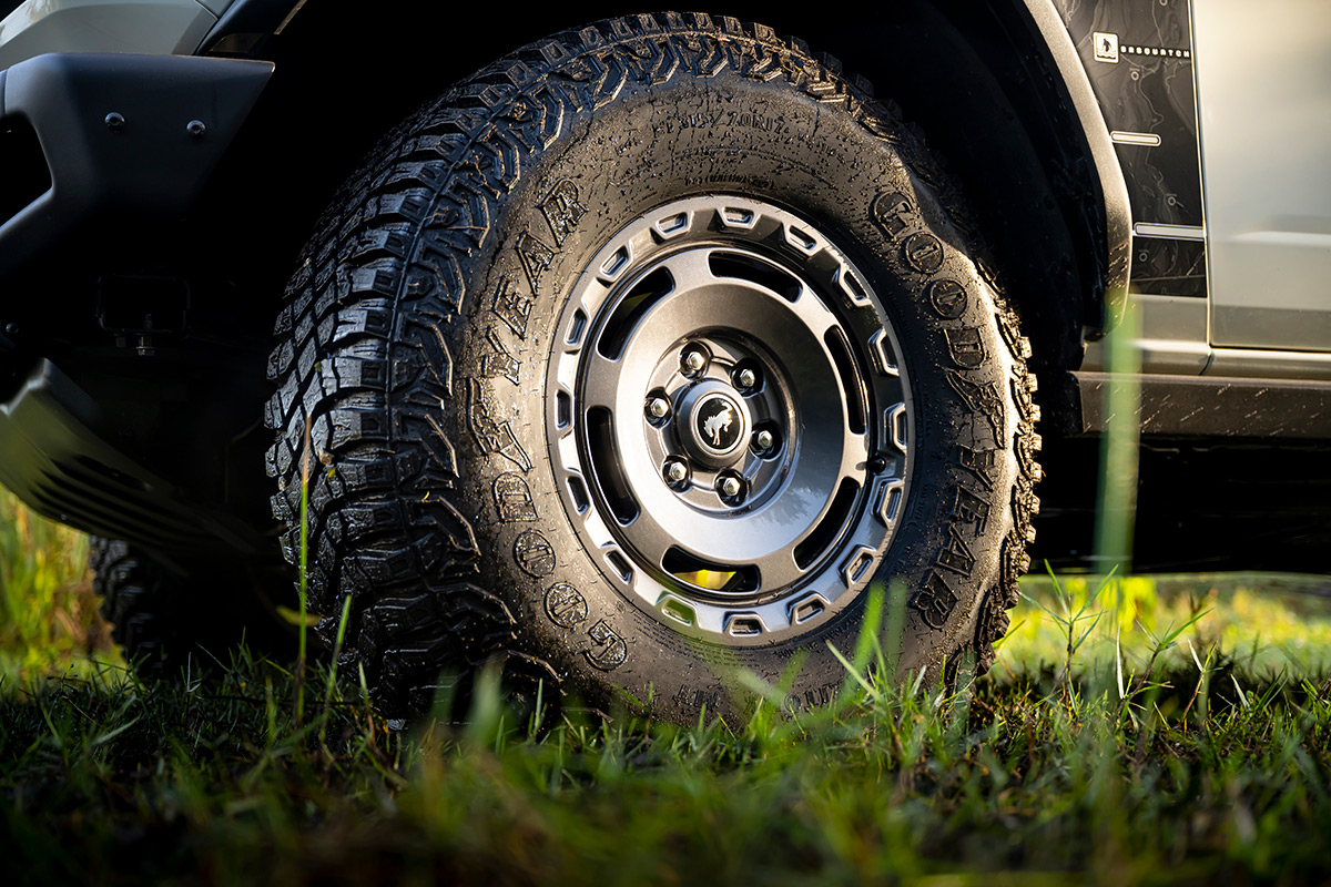 The Sasquatch Package features 17-inch Carbonized Gray-painted alloy wheels with 35-inch Goodyear mud-terrain tires. Additional exterior appointments include rock rails to protect the lower sills, plus a molded-in-color hardtop and roof rack with crossbars.