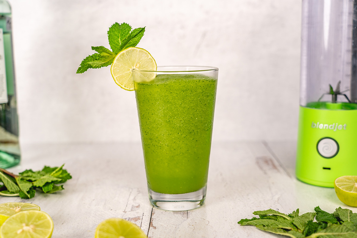 Add rum, lime juice, mint leaves, and agave to the BlendJet. Add ice until the liquid floats to the top. Blend for 1 cycle.