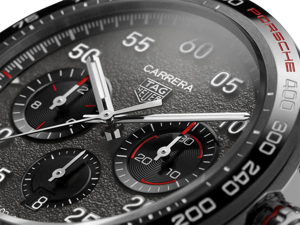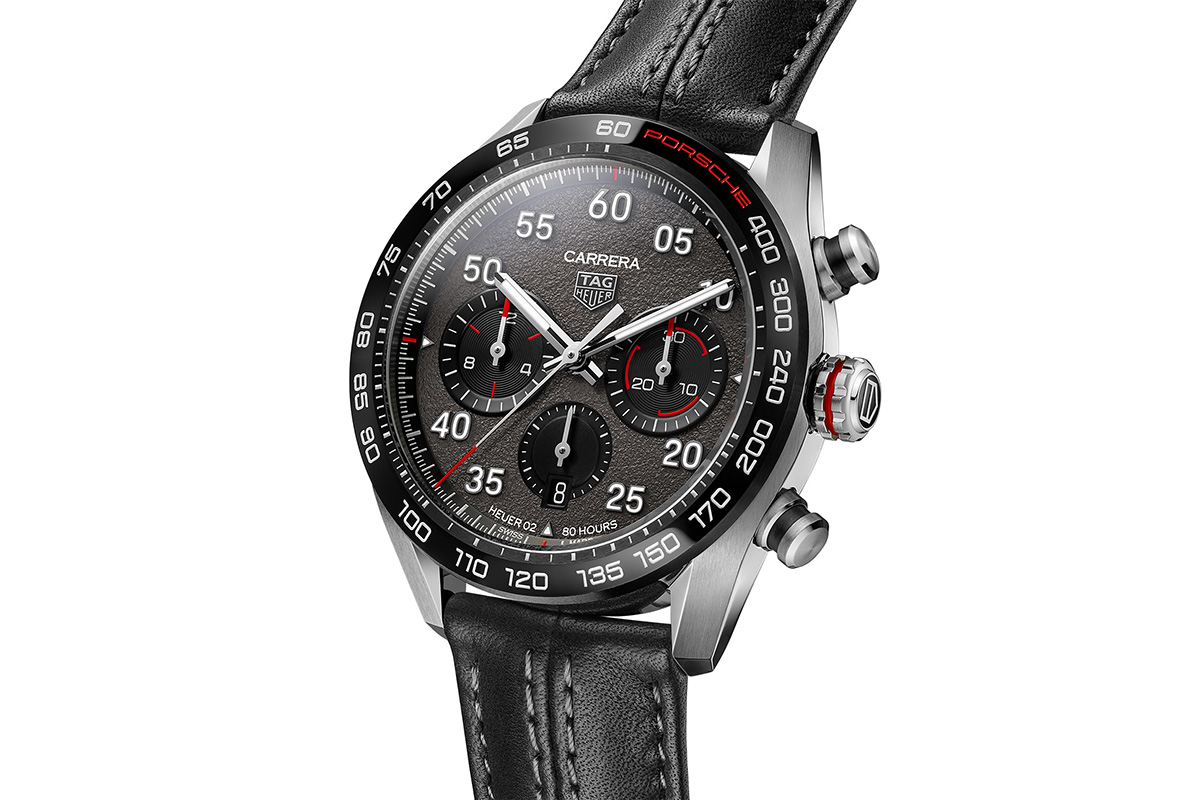 The dial’s asphalt effect, created especially for this watch, expresses a passion for the road, while Arabic numerals suggest the numbers on the dashboard of fine Porsche sportscars. The timepiece is presented either on a soft strap in luxurious calf leather and innovative stitching that echoes the Porsche interior or on an interlocking bracelet reflecting streamlined racing design. At the heart of the timepiece is the in-house Calibre Heuer 02 manufacture movement with an impressive 80-hour power reserve.