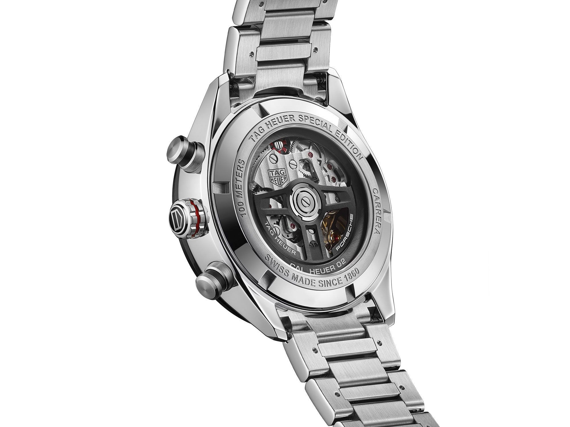 Porsche’s engraved inscription is visible on the bezel and the unmistakable font is also used for the indexes. The Porsche colors of red, black, and grey – which also recall historic Heuer models – are incorporated throughout the watch, and on clear display through the transparent crystal case back is the oscillating mass, which has been redesigned in affectionate tribute to Porsche’s celebrated steering wheel. It is printed with “Porsche” and “TAG Heuer”.