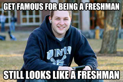 The College Freshman meme, also known as Uber Frosh, is perhaps one of the most recognizable college memes of all time. This is not a new one, but it's still going strong this school year, with plenty of new iterations popping up on a regular basis. As a freshman, Griffin Kiritsy agreed to do a Reader's Digest interview and photo shoot at UNH, and one particularly popular photo ended up on Reddit, where users created the College Freshman meme, poking fun at college freshmen everywhere as they attempt to try new things (and often fail). By midsummer 2011, this meme spread to BuzzFeed, Funny or Die, Memebase, and many more. Kiritsy has gone on to become a new meme, College Senior.