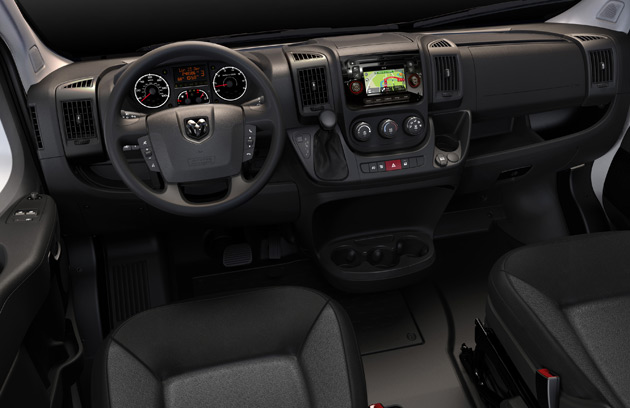 Outside of those caveats, we found that the Pentastar V6 performed very well through its six-speed automatic transmission and the 2014 ProMaster handled nimbly in traffic and on the highway. Because it is front-wheel drive (also unique to the segment), the Ram ProMaster Cargo has a tight turning radius and smart handling characteristics. The optional backup camera is well-placed for maneuvering into a dock, loading door, up a driveway, or back to a trailer.