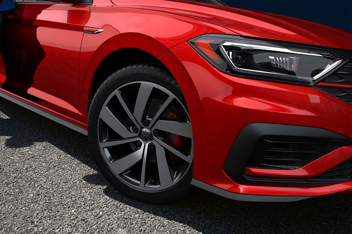 The 2019 VW Jetta GLI features a sports suspension that lowers the car 0.6 inches and gives it a more planted look. Visual cues like the black honeycomb grille with red accent line, a rear spoiler on the deck lid, and a unique finned rear diffuser above chromed exhaust tips are all there to make sure nobody mistakes this for a regular sedan. Golf R brakes with red-painted calipers stand out in the sleek 18-inch aluminum-alloy wheels exclusive to the GLI. Standard LED projector headlamps and LED daytime running lights are also included.