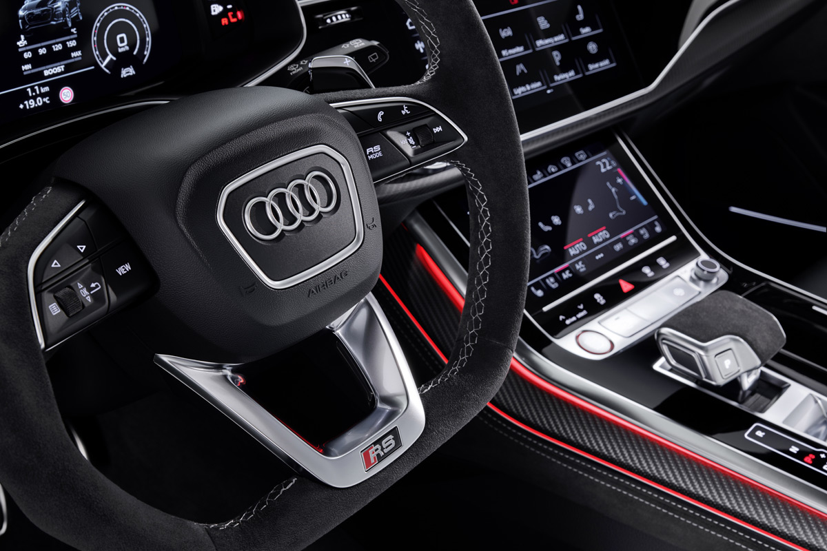 Drivers can customize their driving experience through the standard Audi drive select system with seven different profiles: comfort, auto, dynamic, allroad, offroad and the individually configurable RS-specific modes RS1 and RS2, which can be activated directly via the RS-MODE button on the steering wheel. Audi drive select settings influence the engine and transmission management, power steering, the air suspension, all-wheel steering and engine sound.
