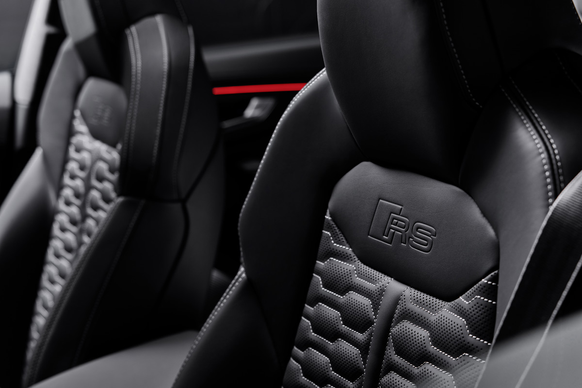Special RS displays in the Audi virtual cockpit and MMI display provide information such as output, g-forces, lap times, temperature, torque and tire pressure. The shift light display prompts the driver to upshift when the rev limit is reached. The optional head-up display also offers several RS-specific graphics.