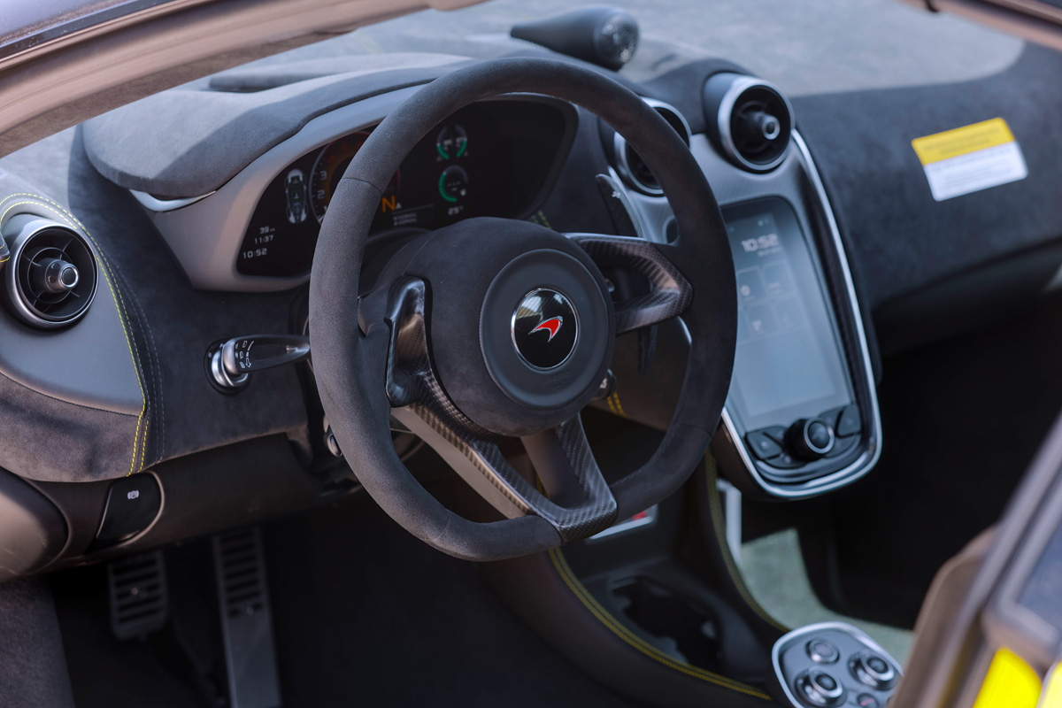 The McLaren 570S Spider has a lot of race car in its DNA and that shows when sitting behind the wheel. The paddle shifters “rock” on the column, allowing up or down shifts from either side. Summer tires are standard equipment, as are adaptive dampers, carbon-ceramic brakes, and launch control. The interior is opulent race car, with leather seating and a few details for comfort. Mostly, though, it’s about the drive, making the purpose of this car very clear.