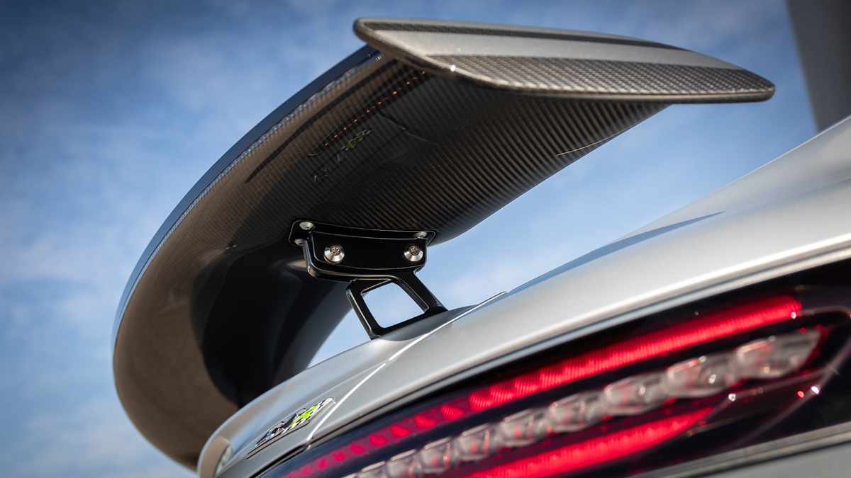 - Newly redesigned carbon fiber roof with lowered center section, matte carbon fiber crossbar and interior trim, carbon fiber side skirt inserts, carbon fiber rear diffuser, carbon ceramic brakes, carbon fiber side mirror housings and a fixed rear spoiler in carbon fiber.