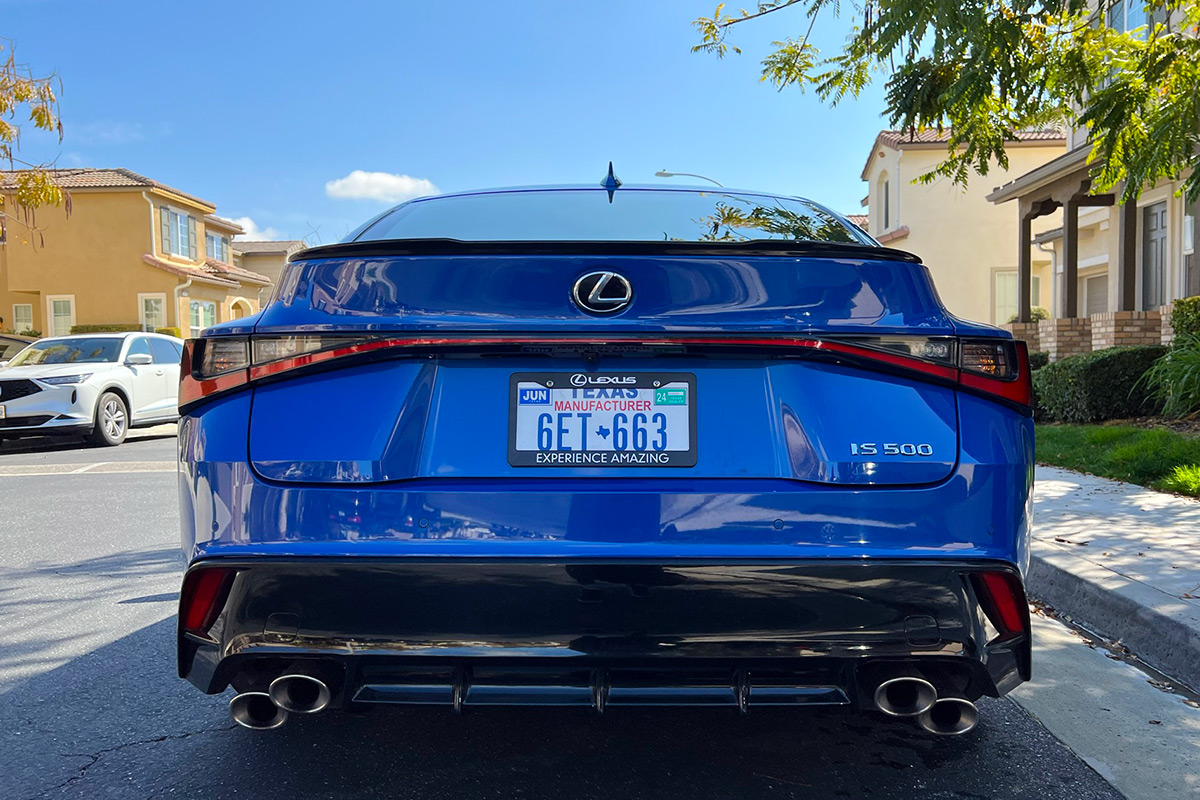Looks wise, I really liked what they have done here. The refreshed styling is very subtle, but it gives it a more modern look. Add to that the power dome (alluding to that big V8 under the hood), unique wheels, and stacked quad exhaust out back, and the IS 500 F Sport stands out just enough for those in the know. While I loved the bright blue “look at me” paint, they also offer the car in more subdued tones if you want to keep a lower profile.