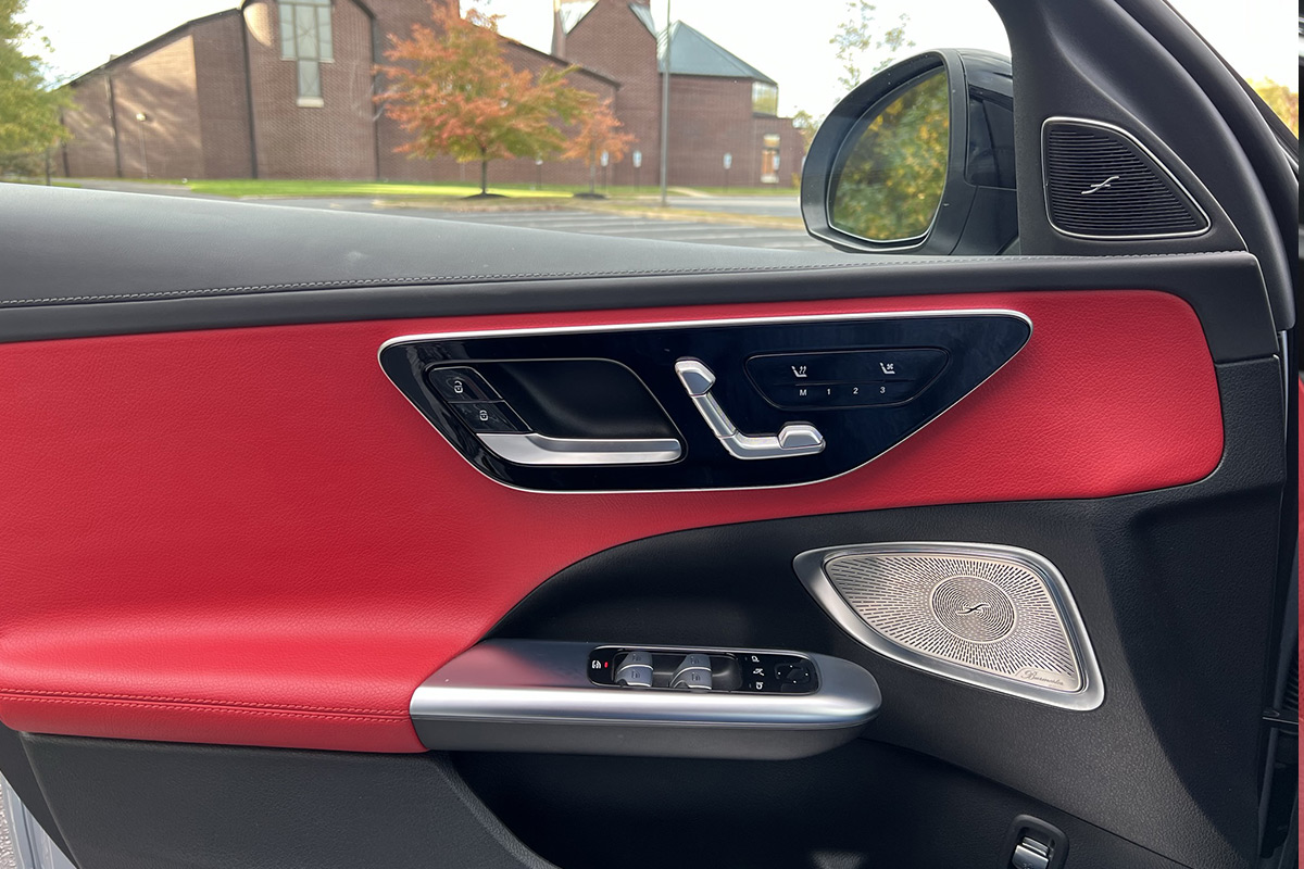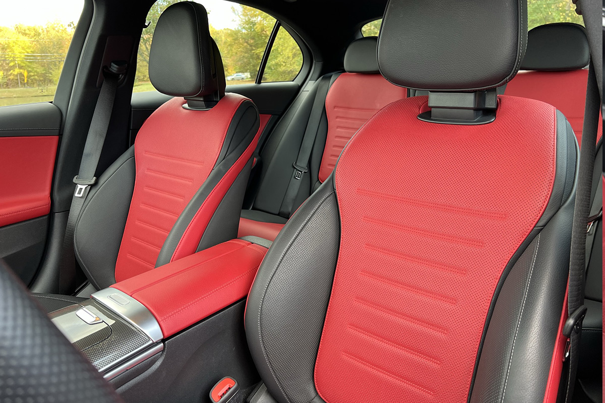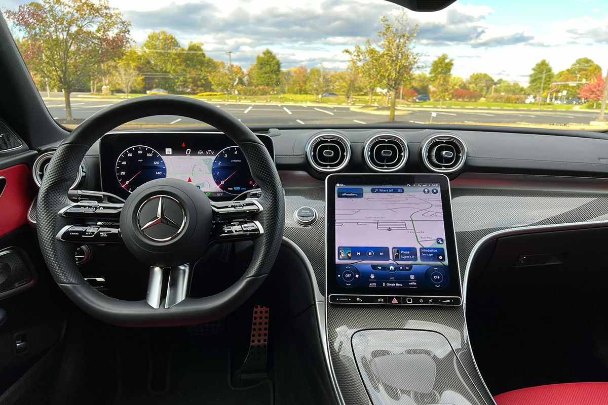 The interior of the 2022 Mercedes-Benz C300 sedan is a thing of beauty, with a clear focus on technology with its freestanding 12.3″ digital instrument panel and new large 11.9″ central touchscreen multimedia display, along with high-quality materials. Our car looked especially sporty with the red/black leather and carbon fiber as far as the eye can see. Seats were super comfy, lots of luxurious details throughout, really a nice place to call home.