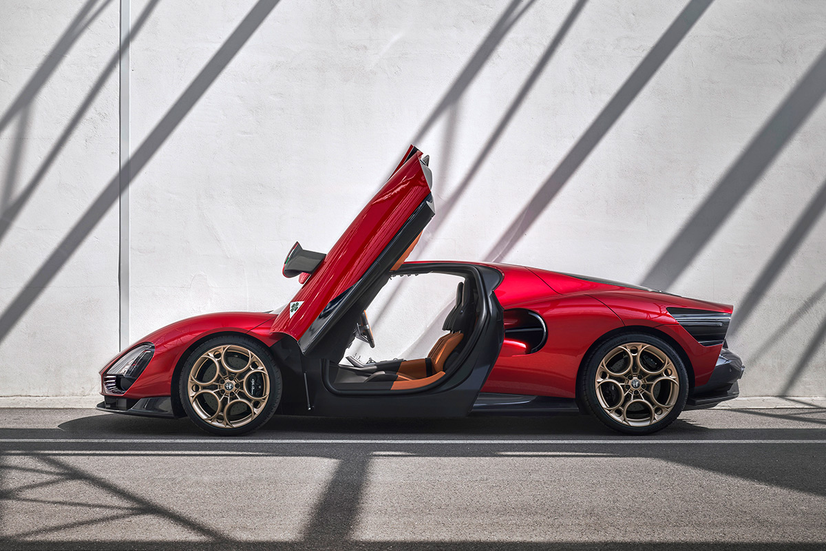 The profile is dynamic and slender, with butterfly doors that feature two large air inlets. The body is projected forward, with surfaces modeled according to Alfa Romeo’s formal expression. Corner openings of the doors and the large wraparound sunroof give the driver a unique, aircraft cockpit view. Opening the bonnet and doors enhances the car’s theatrical design.