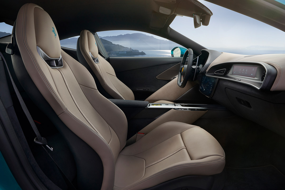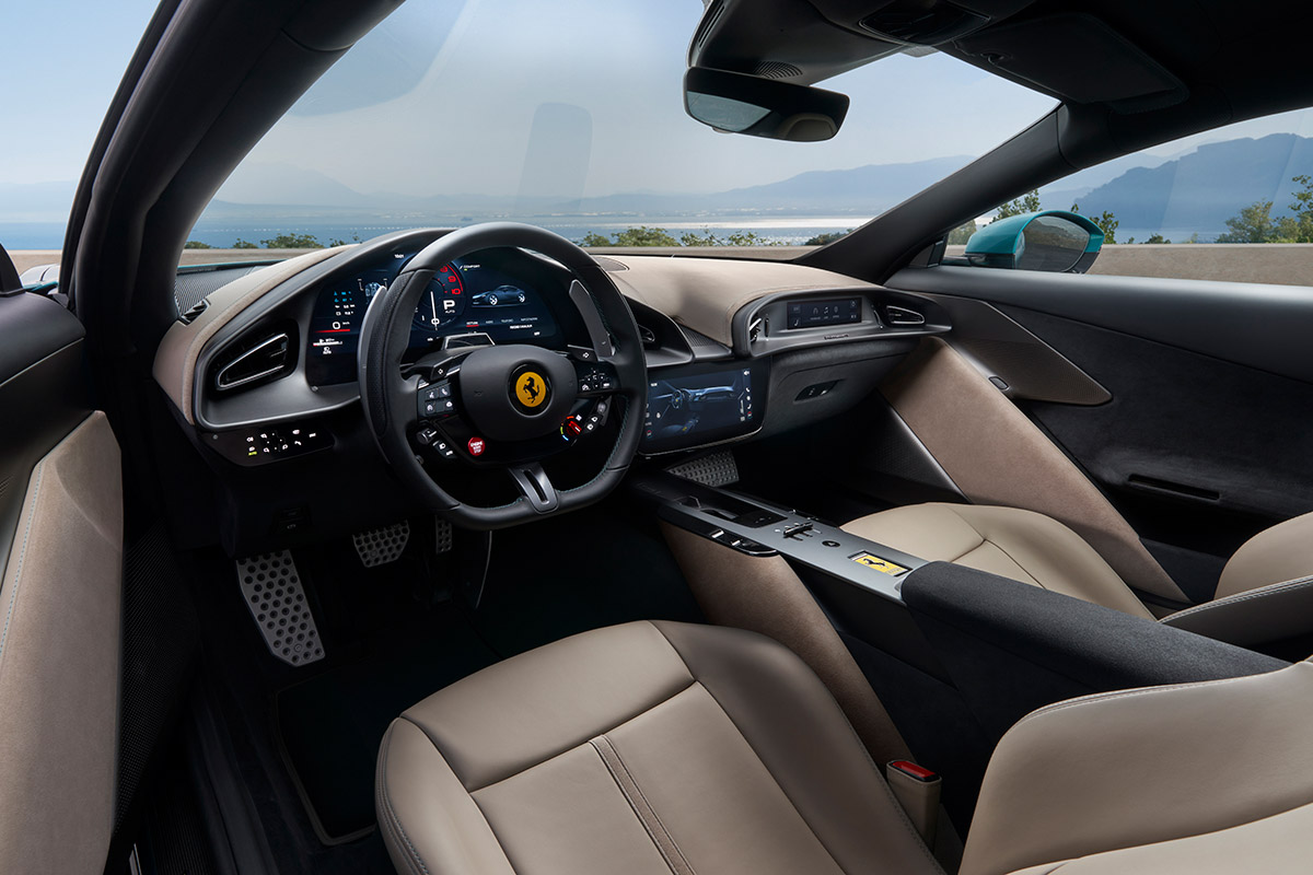 Thanks to upgraded turbochargers, dedicated pressure sensors, and a sophisticated engine control unit shared with the 296 GTB and Purosangue, throttle response is immediate and precise. The performance increase was achieved through a new advanced turbocharging management system, enabling independent control of the rotational speed of the two turbochargers with dedicated calibration.